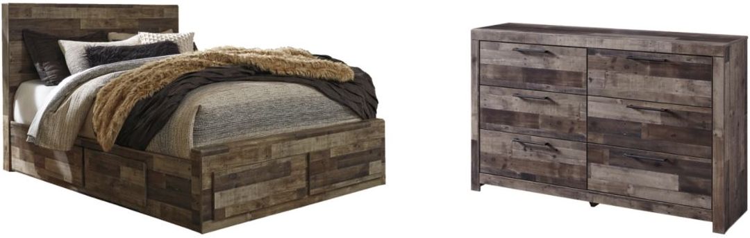 Includes panel storage bed (headboard, 2-drawer storage footboard, 2 underbed storage drawers, rails and slats) and 6-drawer dresser