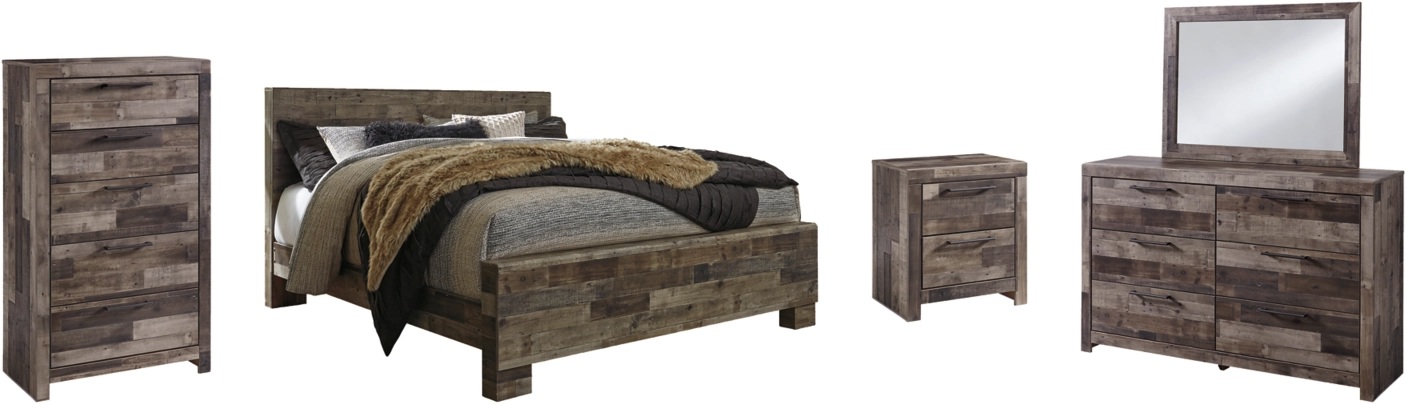 Includes king panel bed (headboard, footboard and rails), 6-drawer dresser with mirror, 5-drawer chest, and 2-drawer nightstand