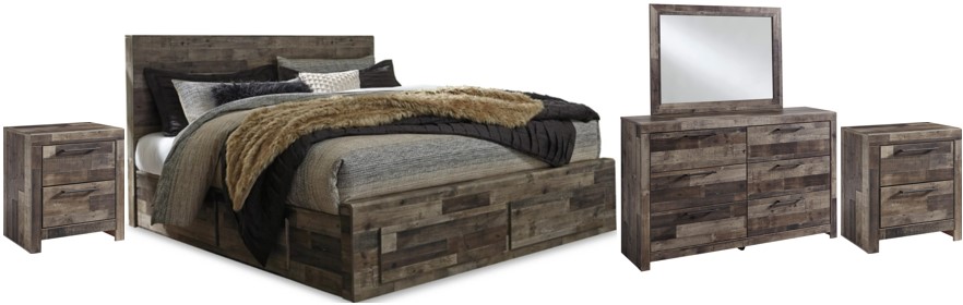 Includes panel storage bed (headboard, 2-drawer storage footboard, 4 underbed storage drawers, rails and slats), 6-drawer dresser with mirror, and two 2-drawer nightstands
