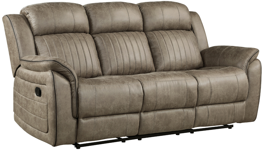 Plush seating features vertical tufting, pillow-top arms, enhanced by the dual end recliners of the sofa. The reclining mechanism is engaged with a pull of the side mounted tabs, taking you from seated to prone in an easy motion.