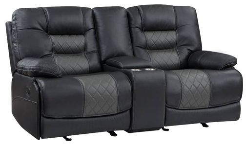 Additional functionality comes in the form of the love seat’s console, its lift-top hidden compartment featuring USB ports, receptacles, and cupholders providing a convenient spot for beverage and accessory storage. Breathable faux leather upholstery is featured in a complementing contrast of two-tone gray for perfect pairing to your home’s décor.