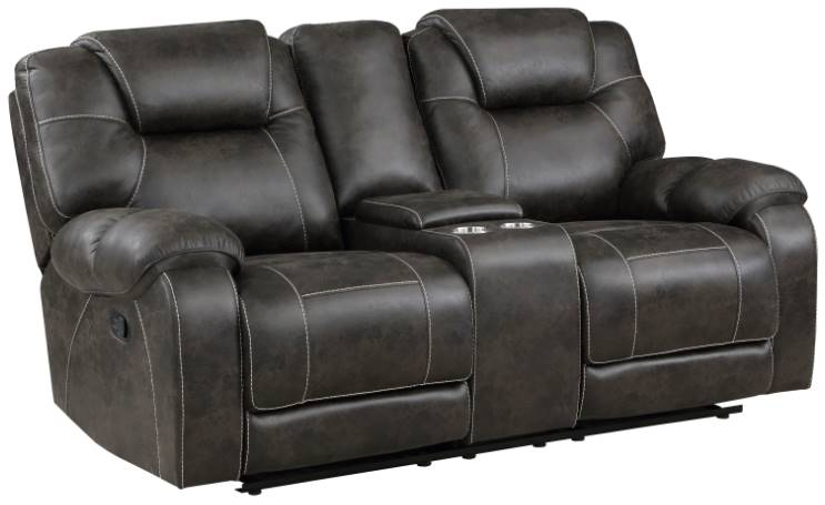 Manual motion mechanisms operate with the pull of a side-mounted tab, that once engaged, takes you from seated to reclined in an easy motion. The love seat’s center console features ample beverage containment with cupholders, as well as featuring a hidden storage compartment, and is flanked by its dual reclining seats.