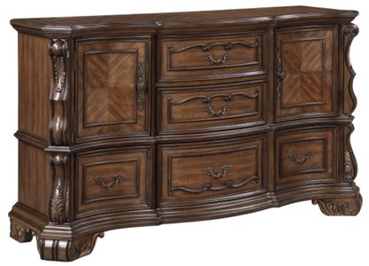 Infuse your bedroom with the regal charm of this traditional dark brown dresser, a masterpiece of classic design and organization. Expertly crafted with rich pecan and ash burl veneers, the stately silhouette is elevated by intricate carvings and opulent gold accent detailing.Read More