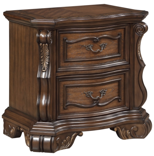 Enhance your bedside with this exquisite traditional dark brown nightstand, a masterpiece of classic design and functional luxury. Expertly crafted from rich pecan and ash burl veneers, this piece features a deep finish elevated by ornate gold accent detailing.Read More