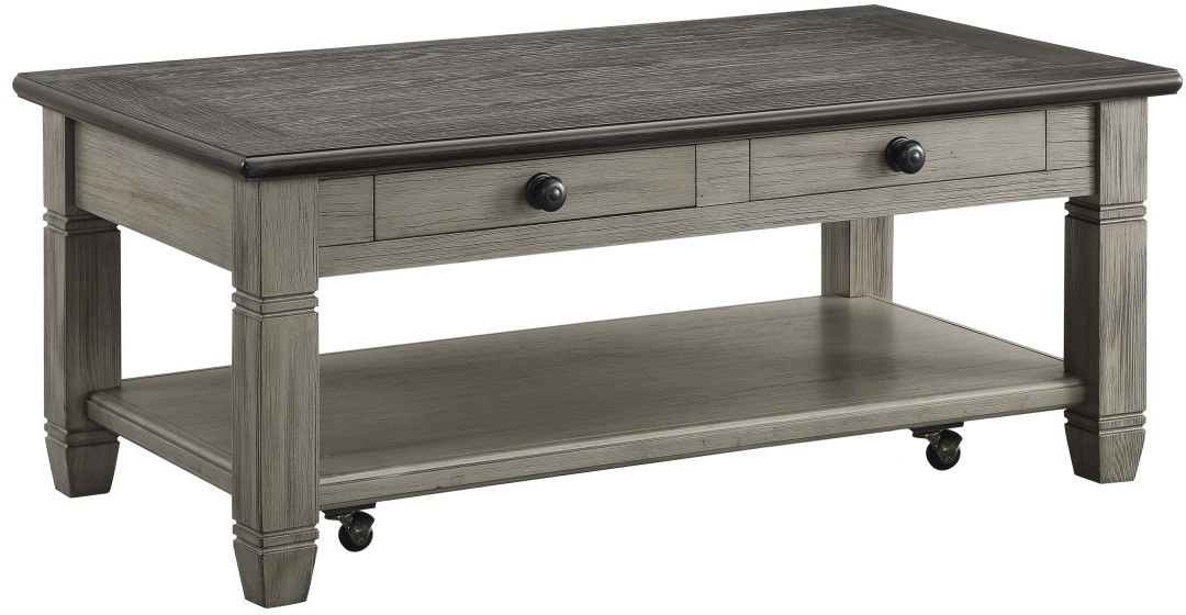 Inspired by the aesthetic of a casual country home and providing functional decorative accent for your living room is the occasional table set of the Granby Collection. The two-tone look of the acacia and pine solids base, finished in antique gray, and the oak veneer of the cocktail table’s coffee-finished top, presents as a harmonious combination of color, perfect for your home. Dark finished metal knob hardware fronts the functional drawers of the cocktail table while providing subtle contrast to the finish of the collection. An open display shelf creates a perfect spot for display of your decorative accessories, while casters allow for ease of movement of the cocktail table within your space.