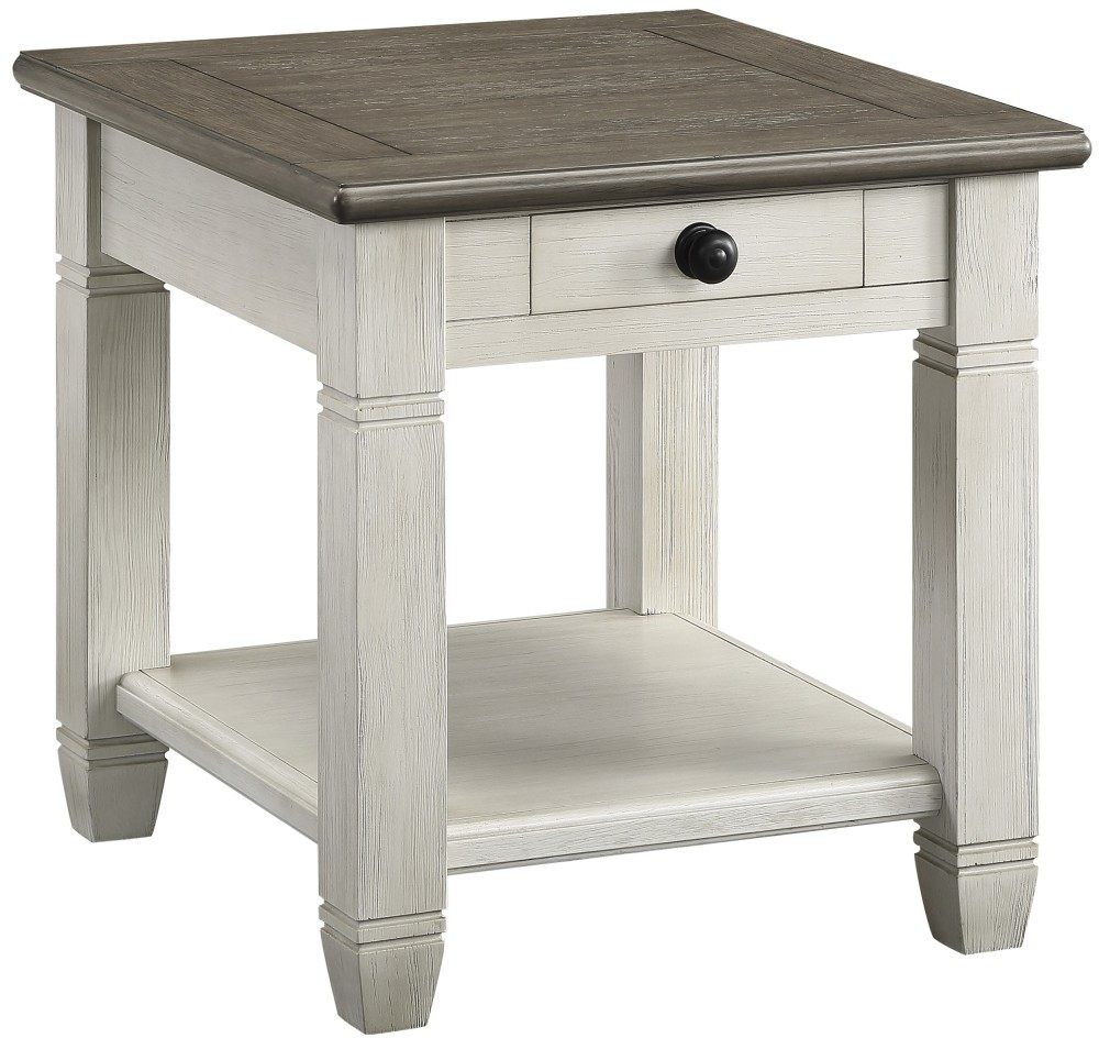 Inspired by the aesthetic of a casual country home and providing functional decorative accent for your living room is the occasional table set of the Granby Collection. The two-tone look of the acacia and pine solids base, finished in antique white, and the oak veneer of the end table’s rosy brown-finished tops, present as a harmonious combination of color, perfect for your home. Dark finished metal knob hardware fronts the functional drawer while providing subtle contrast to the finish of the collection. An open display shelf creates a perfect spot for display of your decorative accessories.