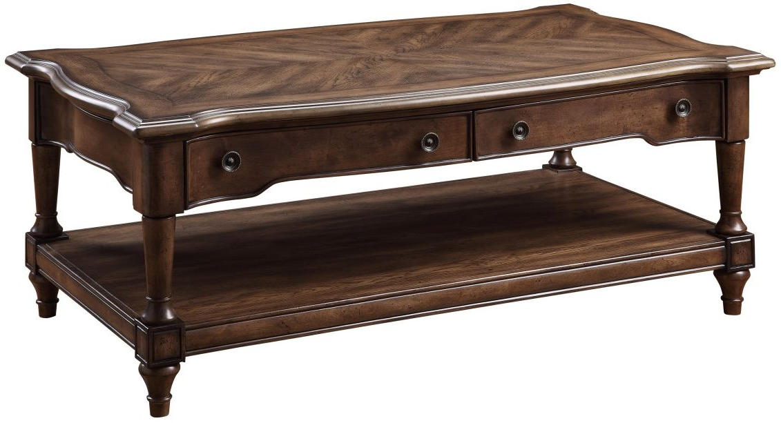 The elegant profile of the Heath Court Collection is comprised of classic elements that have been combined to create the perfect addition to your home’s traditional décor. The cocktail table’s top features white oak veneer in a sunburst pattern with a brown finish that highlights the distinct wood grain. Antiqued brown finish graces the metal knob hardware that fronts the table’s functional drawers. An open display shelf is supported by turned legs while the decorative corners of the table’s profile lend classic style to the collection.