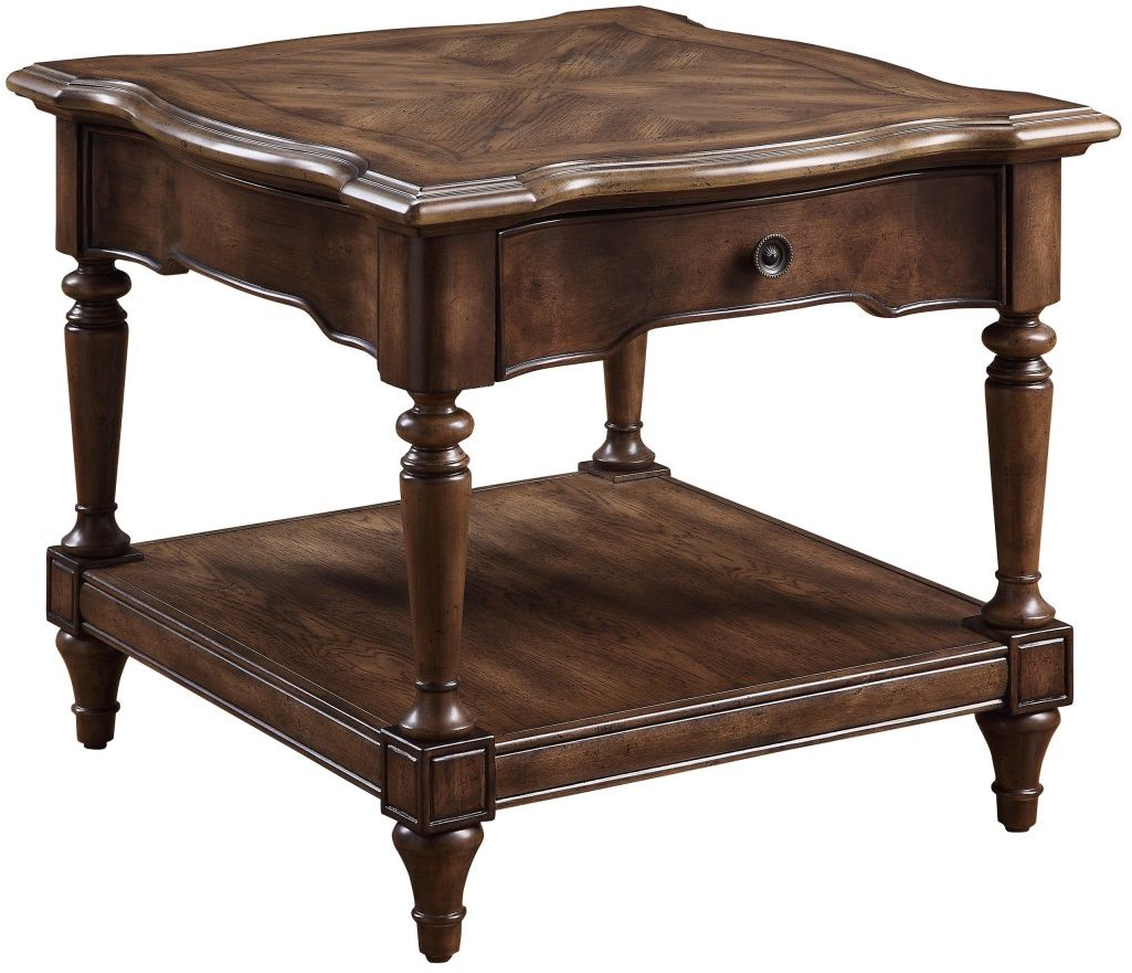 The elegant profile of the Heath Court Collection is comprised of classic elements that have been combined to create the perfect addition to your home’s traditional décor. The end table’s top features white oak veneer in a sunburst pattern with a brown finish that highlights the distinct wood grain. Antiqued brown finish graces the metal knob hardware that fronts the table’s functional drawers. An open display shelf is supported by turned legs while the decorative corners of the table’s profile lend classic style to the collection.