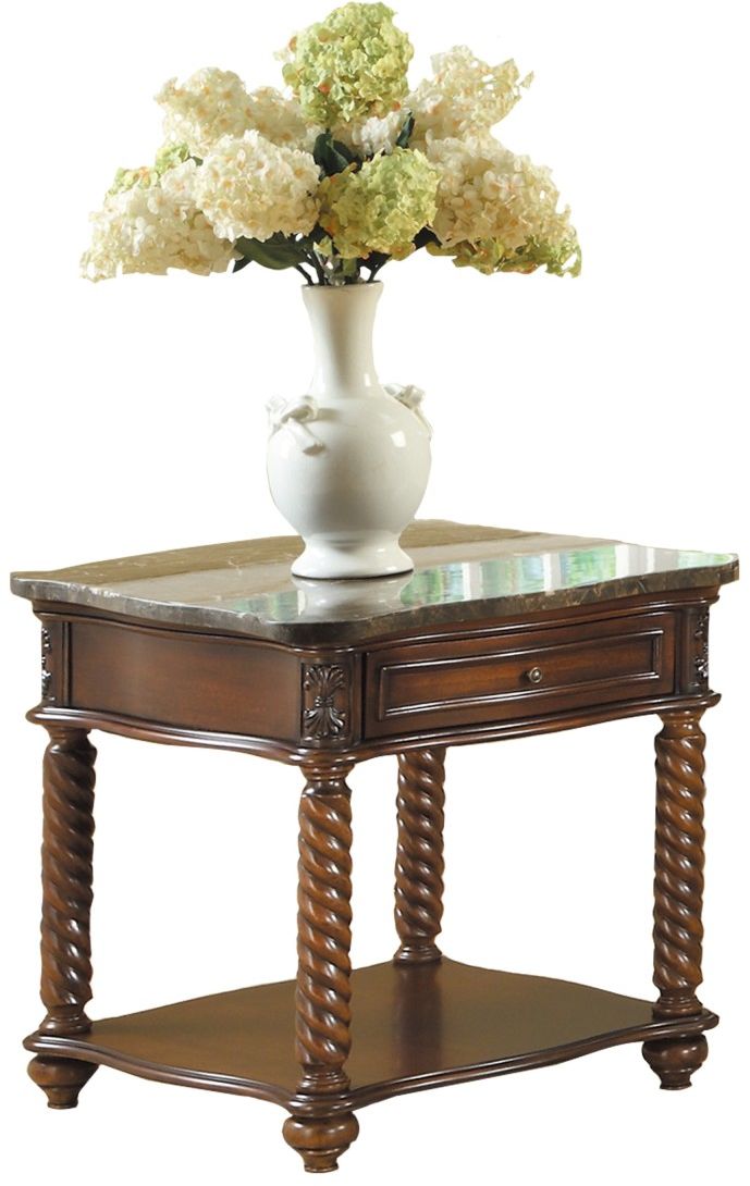 Serpentine lines form the boxed table top of the Lockwood Collection end table; each crowned with elegant marble and aproned with short grain mahogany border. Wheat-sheaf carved accents top spiral-turned legs while display shelving is supported by traditional bun feet. These unique and graceful features are highlighted mahogany finish making the Lockwood Collection a perfect addition to your living room. Coordinating cocktail table and sofa table are also available.Read More
