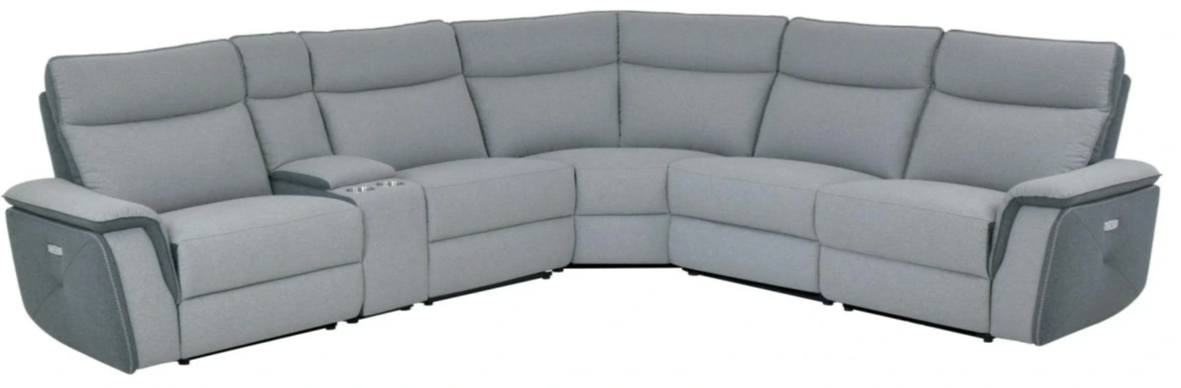 The Homelegance® Maroni 6-Piece Gray Modular Power Reclining Sectional with Power Headrest combines spacious seating, versatile configuration, and modern comfort. Featuring power recline, adjustable headrests, and USB charging, it includes a storage console with cupholders. Upholstered in leather match, this sectional offers style, function, and relaxation for family gatherings.Read More