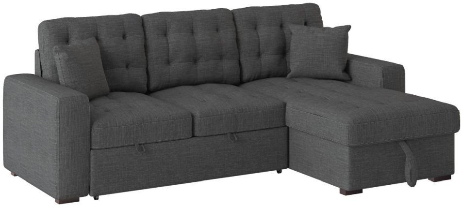 The versatility and functionality of the McCafferty Collection goes beyond that of a traditional sofa. Covered in dark gray fabric, the transitional profile of this seating group is complemented by stitch tufting and track-style arms. Conveniently stored beneath the sofa is a pull-out trundle that rises to create a bed while the top of the attached chaise opens to reveal under-seat storage.
