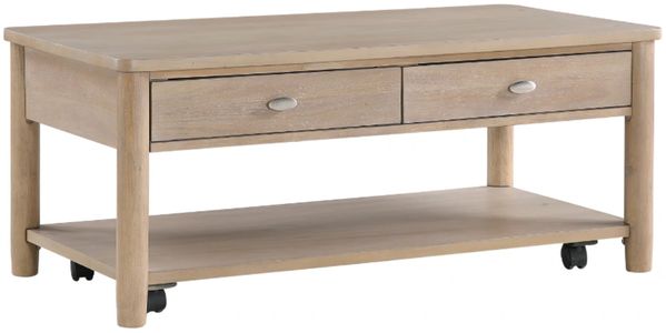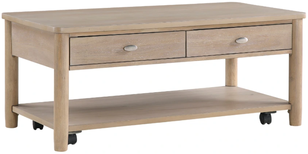 It offers ample storage with two smooth-gliding dovetail drawers for organizing essentials and a bottom open shelf for displaying décor or storing books. The polished chrome tone knobs add a touch of elegance, complementing the table's warm and inviting aesthetic. Equipped with casters, this coffee table allows for easy movement and flexible arrangement in your space. This piece combines practicality with rustic charm, making it a perfect addition to any living room.