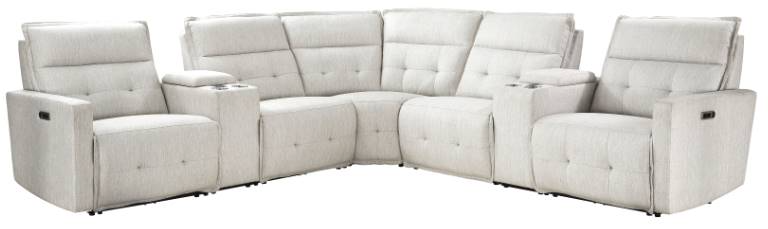 Includes Seven pieces: Power LSF reclining chair and console and power reclining armless chair and corner seat and armless chair and console and power RSF reclining chair