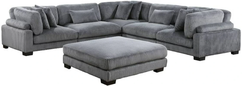 Configurable to your available space, the Traverse Collection allows for the addition and detachment of pieces for a customized seating experience. The 6-piece sectional configuration consists of three corner units paired with two armless chairs, and an ottoman. The gray corduroy fabric upholstery creates a plush expanse for a soft touch experience.Read More