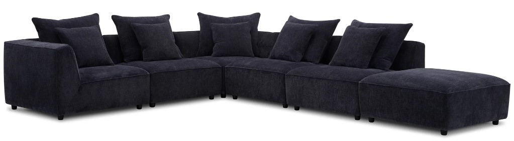 The comfort cushion is encased in cotton, down-proof channeled ticking to help it keep its shape and prevent feather migration. The cushions are padded with high-density Dacron and topped with sterilized down and feathers for maximum plushness. The sectional is built to last, with wood frames that feature reinforced corner blocks for lasting strength and stability. Select woods are kiln-dried to minimize warping and splitting while ensuring longevity. This attention to detail ensures that your sectional will remain sturdy and reliable. Whether you're looking for a cozy corner for movie night or a space to entertain guests, our 5-piece modular sectional has you covered. with its modular design, you can arrange the pieces to fit your space and your needs.